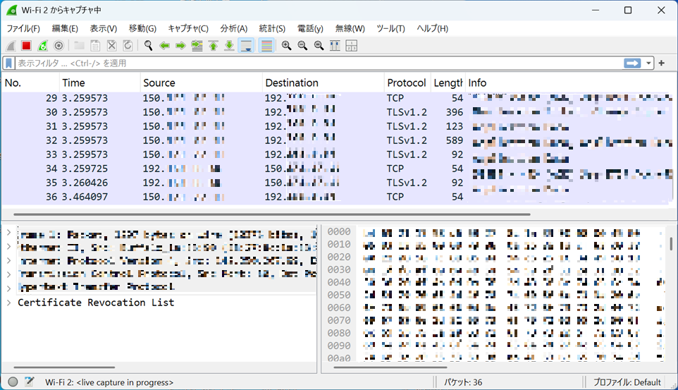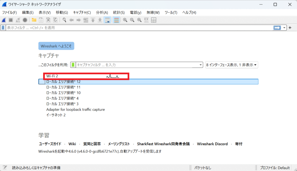インストール方法については、今回、省略します。Wiresharkを起動します。