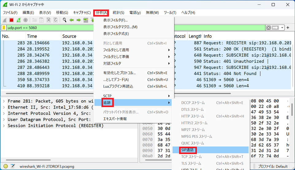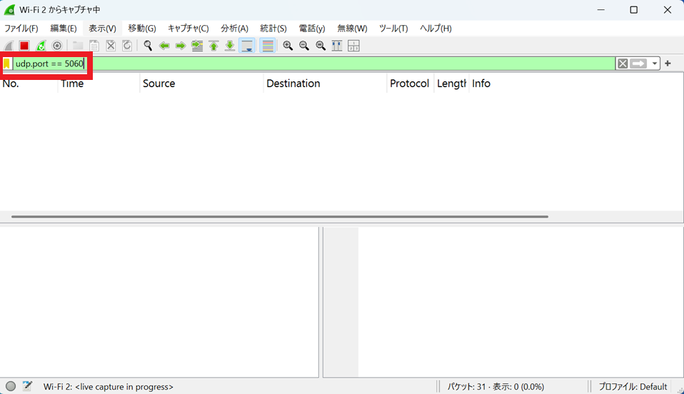 赤枠部に「UDP.port == 5060 」入力するとUDPポート5060だけの通信データが表示されます。