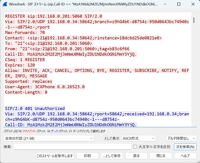 赤文字は、 ソフトフォンPC(Wireshark)からSIPサーバーへ送信してデータで、青文字は、SIPサーバーからソフトフォンPC(Wireshark)に送信したデータが確認できます。